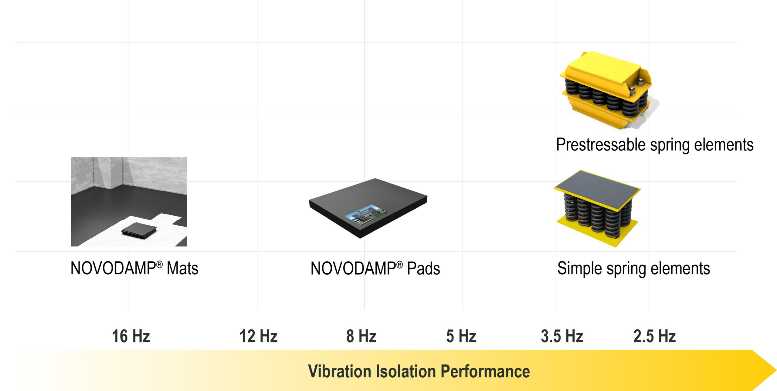 Avec un domaine d’application commençant à environ 8 Hz, NOVODAMP® élargit notre gamme de solutions d’isolation vibratoire en offrant une solution haute performance pour les besoins à fréquences plus élevées — complétant parfaitement nos éléments à ressort conçus pour la plage de basses fréquences.